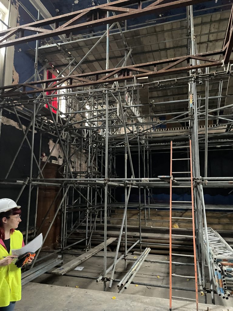On August 22nd scaffolding was erected in Spilsby Sessions House! The birdcage scaffold was partially erected in the main hall. This is an important stage in the project because it allows for closer inspection of the ceiling and roof void.
